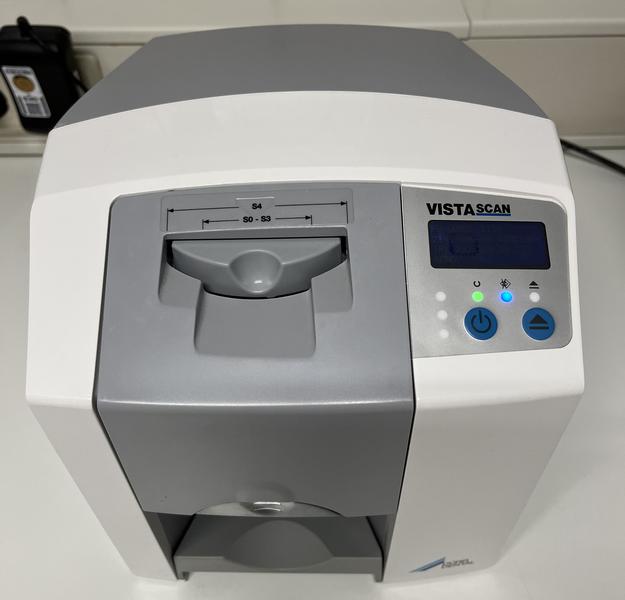 Statt auf einem herkömmlichen Röntgenfilm wird das Bild auf eine Folie gespeichert, die dann über einen Scanner „Dürr Vista Scan“ in die EDV eingelesen wird.Wie früher das „kleine Röntgenbild“, nur haben wir es jetzt auf dem Bildschirm.